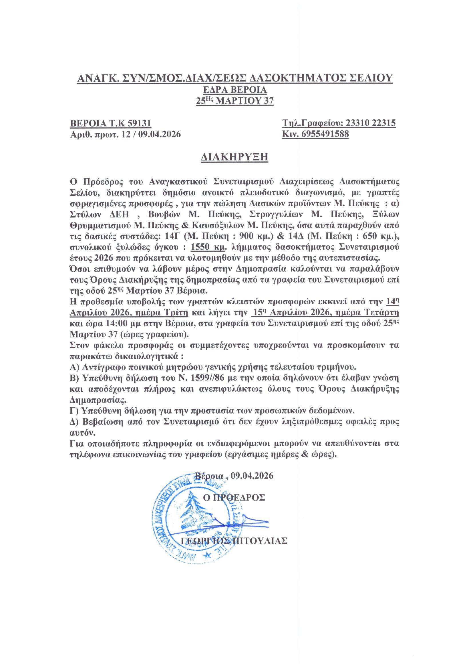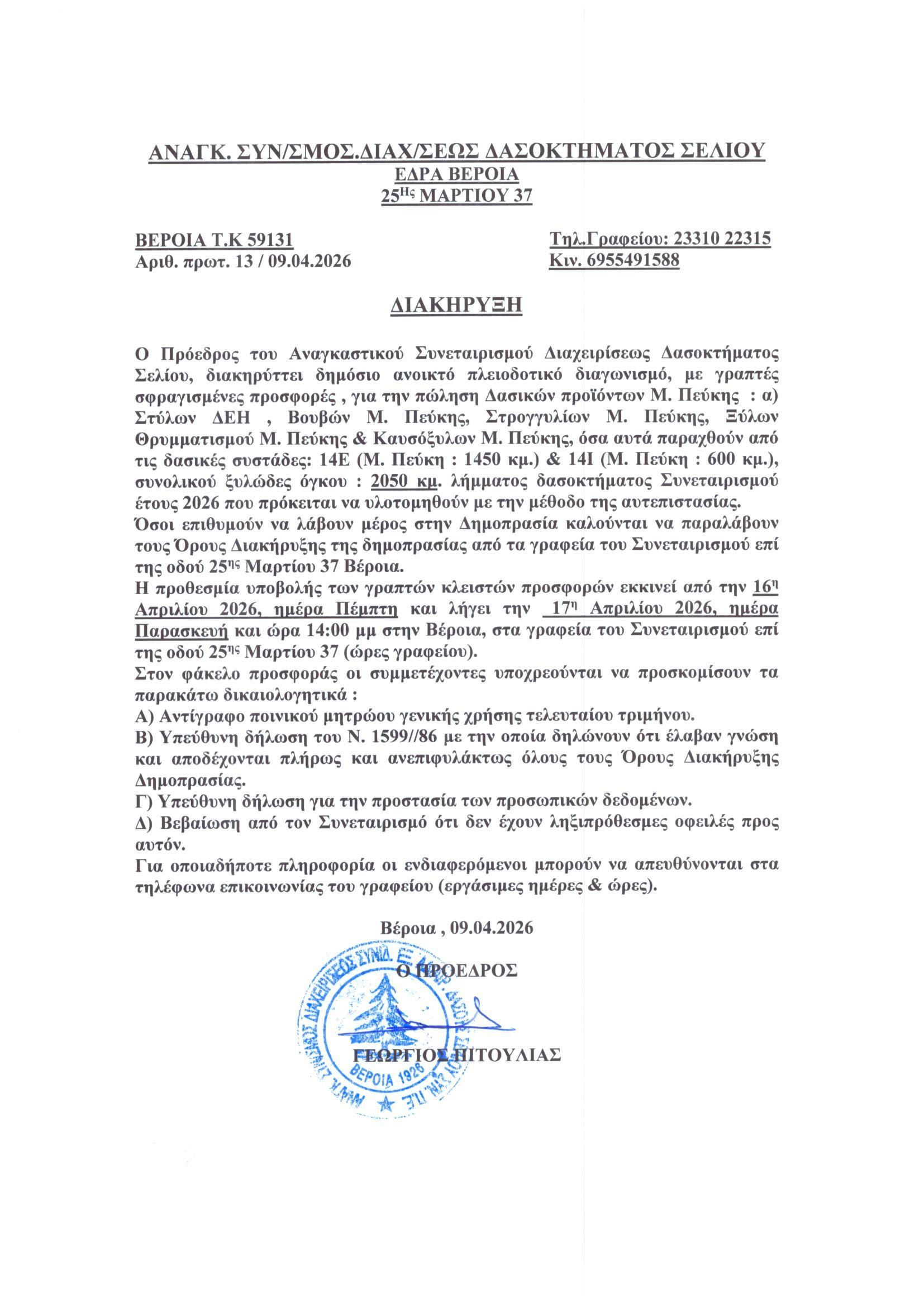 ΑΣΔΔ Σελίου Empty Εκτύπωση Email Διακήρυξη δημοπρασίας πώλησης δασικών προϊόντων έτους 2026 Διακυρήξεις δημοπρασιών Προηγούμενο Επόμενο