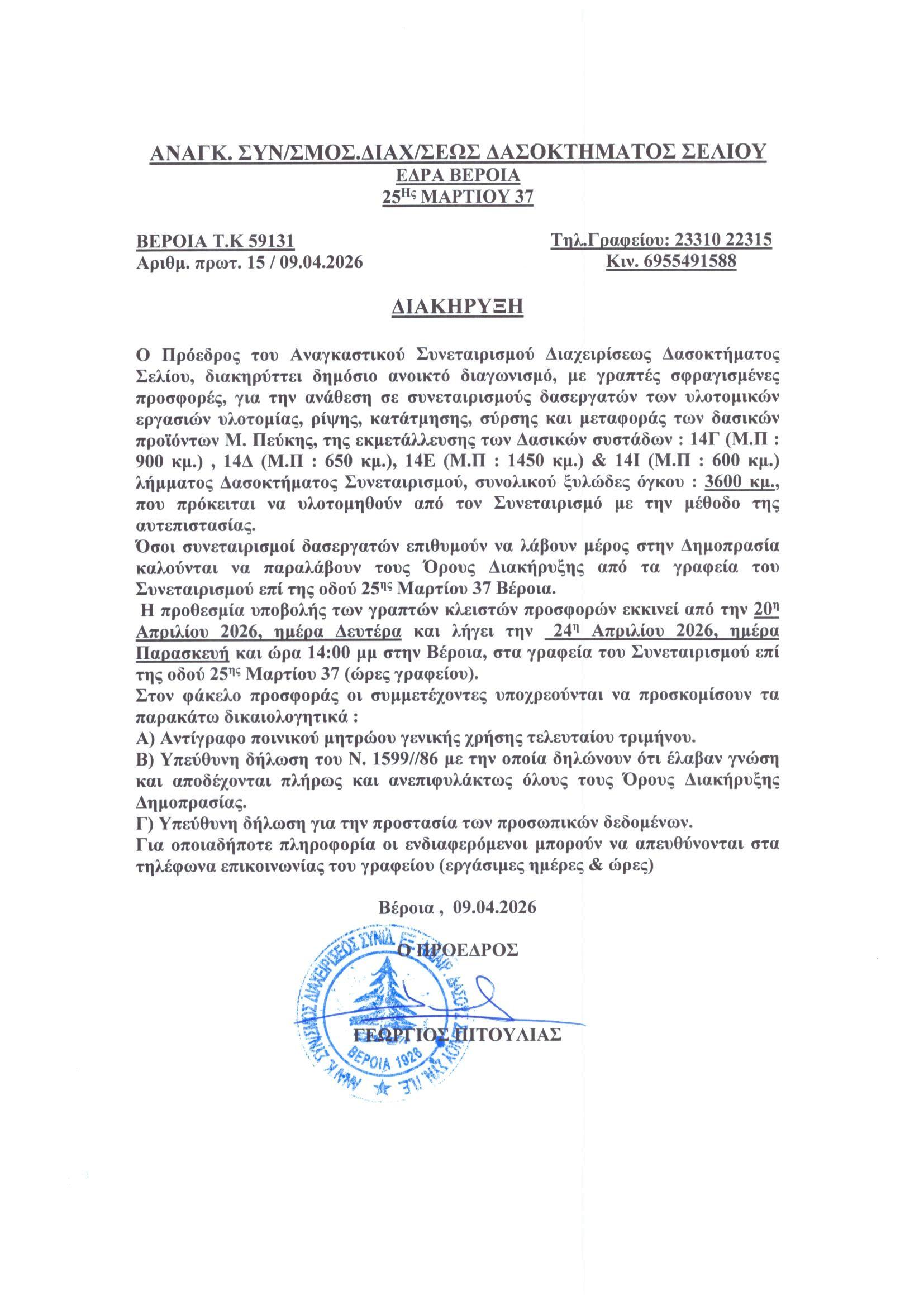 ΑΣΔΔ Σελίου Empty Εκτύπωση Email Διακήρυξη δημοπρασίας ανάθεσης έργου υλοτομικών εργασιών αυτεπιστασίας δασικών προϊόντων έτους 2026 Διακυρήξεις δημοπρασιών Προηγούμενο Επόμενο
