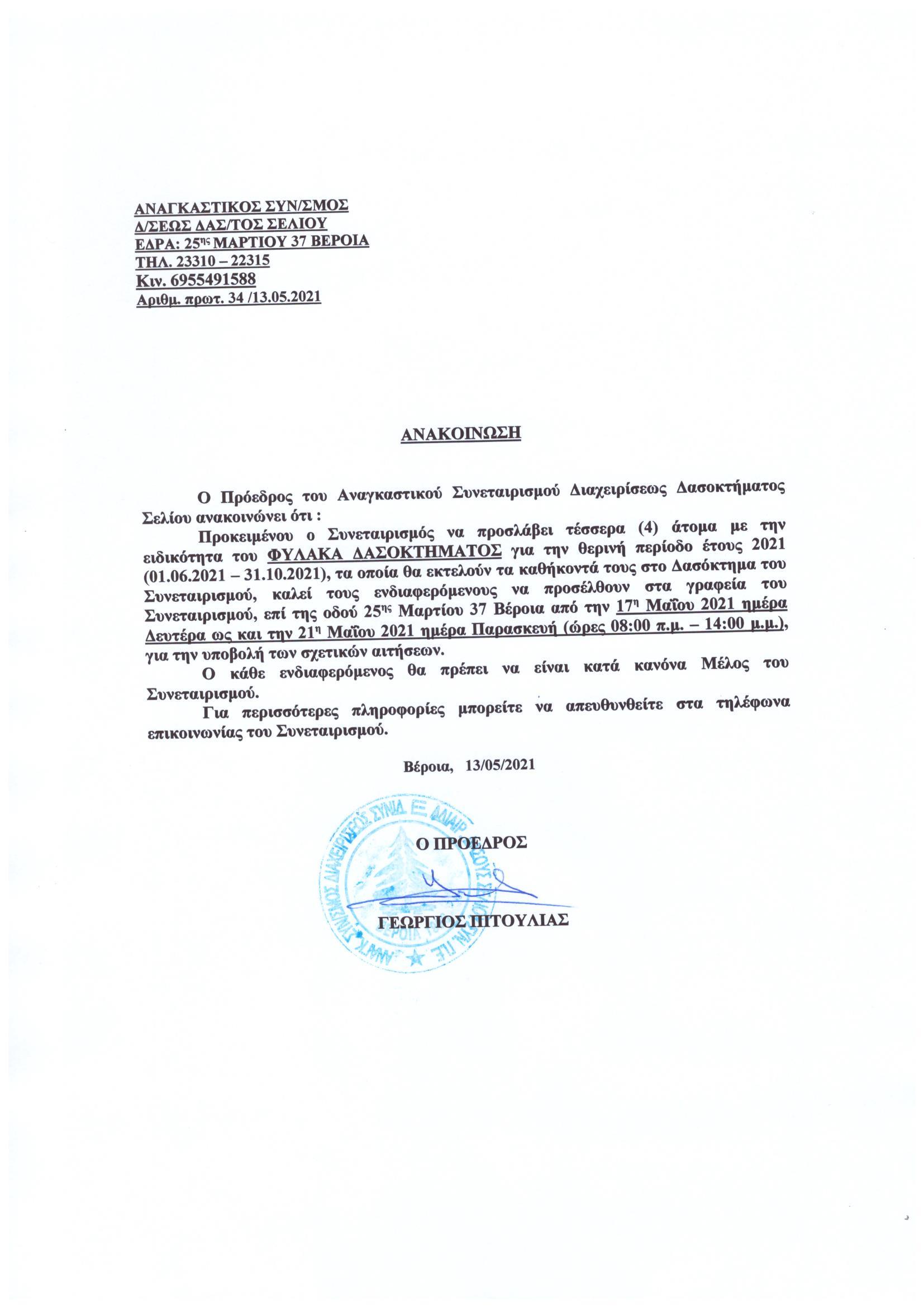 ΑΣΔΔ Σελίου Empty Εκτύπωση Email Ανακοίνωση πρόσληψης φυλάκων δασοκτήματος 2021 Εποχικό προσωπικό Σέλι Δασοφύλακες Εποχικό προσωπικό Δασόκτημα πρόσληψη εποχικού προσωπικού Προηγούμενο