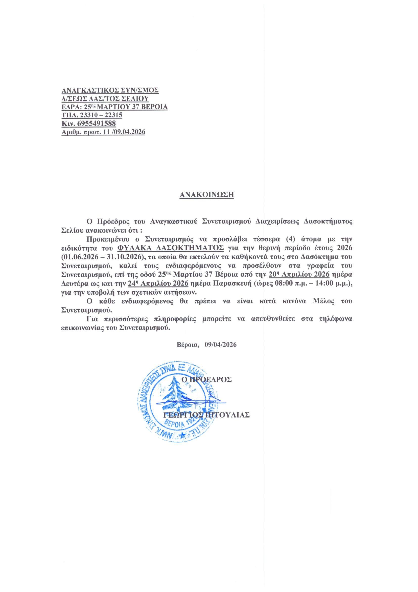 ΑΣΔΔ Σελίου Empty Εκτύπωση Email Ανακοίνωση πρόσληψης φυλάκων δασοκτήματος 2026 Εποχικό προσωπικό Σέλι Δασοφύλακες Εποχικό προσωπικό Δασόκτημα πρόσληψη εποχικού προσωπικού Επόμενο