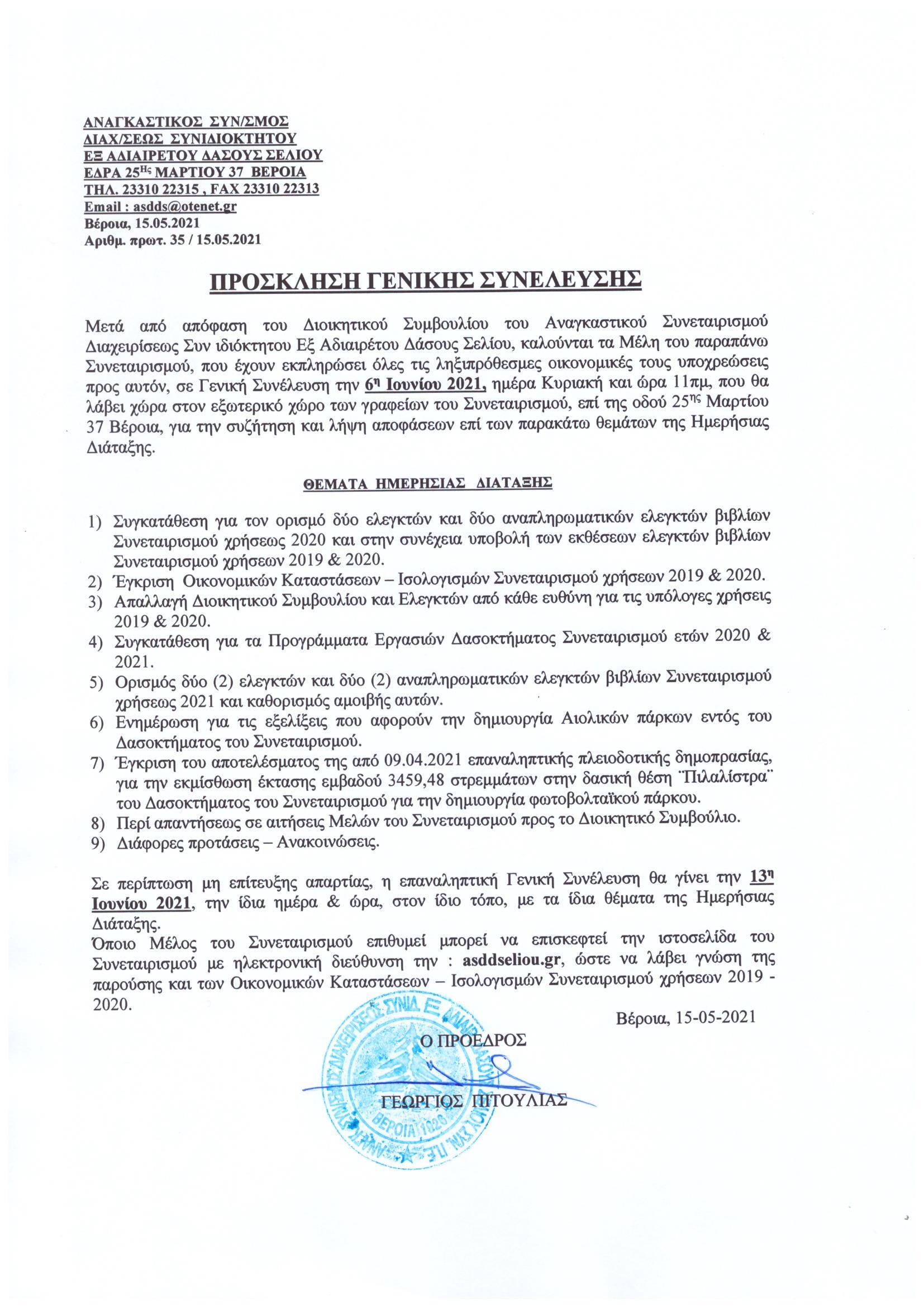 Πρόσκληση Γενικής Συνέλευσης Μελών Συν/σμού 2021